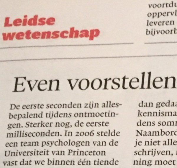 De eerste seconden zijn allesbepalend tijdens ontmoetingen. Sterker nog, de eerste milliseconden. In 2006 stelde een team psychologen van de Universiteit van Princeton vast dat we binnen één tiende van een seconde een eerste indruk van iemand vormen [...]